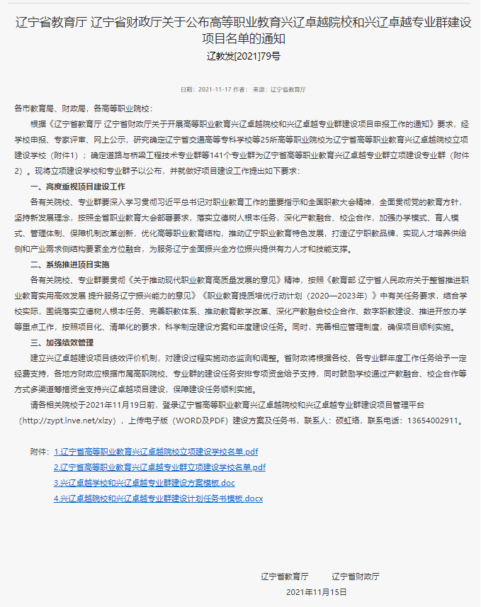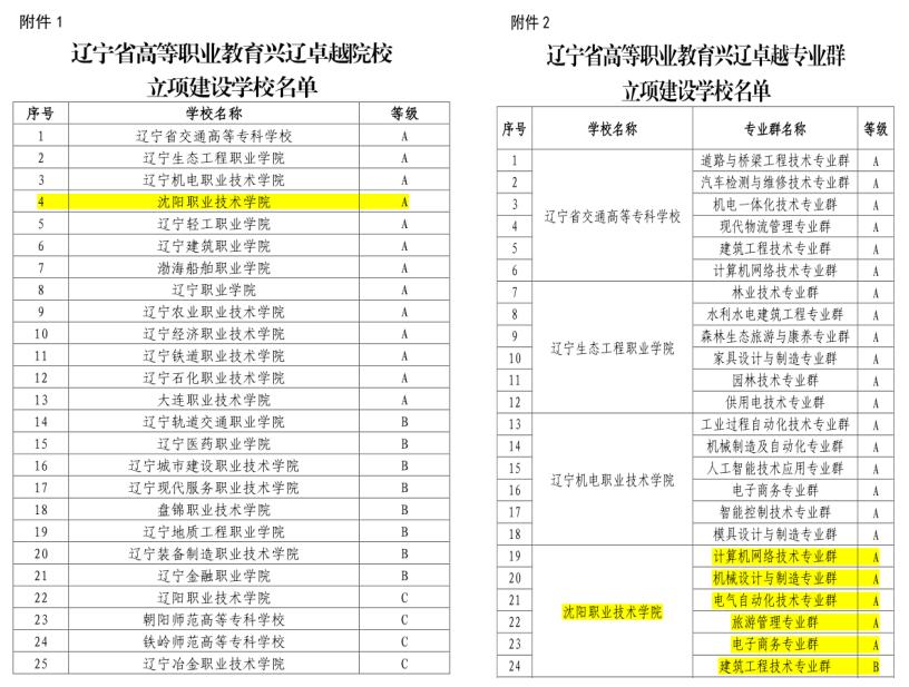 2021年11月15日,辽宁省教育厅、省财政厅发布了《关于公布高等职业教育兴辽卓越院校和兴辽卓越专业群建设项目名单的通知》(辽教发【2021】79号),我院成功获批为兴辽卓越院校,同时计算机网络技术、机械设计与制造、电气自动化技术、旅游管理、电子商务及建筑工程技术6个专业群均被确定为兴辽卓越专业群。