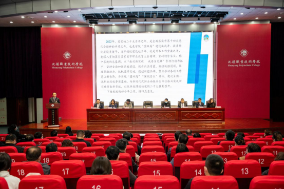 党委书记王久成教授在会议上做题为《创新突破勇当先锋 奋力开创学院改革发展新局面》的讲话。王书记指出,2022年是党的二十大召开之年,是全面落实市第十四次党代会精神的开局之年,也是学院“国双高”建设决战年、提质培优建设关键年、省卓越校建设起步年,也是升本工作重要之年。要深入贯彻落实国家省市职业教育大会精神,坚持稳字当头、稳中求进的总基调,以“振兴新突破 我要当先锋”专项行动为抓手,坚持全面加强党的建设,提升内涵质量,补短板强弱项,促改革激活力,抓机遇寻突破,谋创新塑品牌,努力推动各项工作再上新台阶,为实现“国双高”“保级晋位”目标,建设全国一流职业院校夯实基础,为新时代沈阳全面振兴全方位振兴实现新突破作出新贡献,以优异成绩迎接党的二十大胜利召开。王书记代表学院党委对学院教职工提出四点要求,一要提高站位,把握大势,坚定不移抓住用好战略机遇。准确研判大势,科学把握大势,重视战略和策略,是习近平总书记治国理政的基本方略。做好今年学院工作,也要跳出教育看教育,立足全局看教育,放眼长远看教育,要提高政治站位、把握职教大势、服务振兴发展。二要发力重点,创新突破,推动学院高质量发展。各单位、各部门要紧紧围绕学院年度重点工作,详细谋划具体措施,用好绩效杠杆,形成激励导向,切实补短板扬优势、求突破谋创新、抓亮点出成果。坚持质量党建和精准思政,打造党建和思政工作品牌;开展“振兴新突破 我要当先锋”专项行动,乘势打赢“国双高”建设决战;以标准化建设带动提升内部治理现代化。三要紧跟时代,踔力奋发,在躬身实践中增强本领。新时代沈阳全面振兴、全方位振兴实现新突破,离不开职业教育的振兴和突破,要以沈阳人主人翁的秉性,勇立潮头的天性,精工细作的品性,主动担当作为,为打造沈阳幸福教育品牌贡献智慧和力量。锤炼政治品格,提高政治修养;发扬斗争精神,增强斗争本领;勇于自我革命,提升思想境界。四要强化保障,汇聚力量,大力营造良好干事创业氛围。学院的发展离不开全体党员干部的引领示范,更离不开良好的政治生态。全体党员干部和广大教职工要从自身做起,以身示范,充分发挥表率作用,营造积极向上的良好氛围,为学院建设发展保驾护航。坚持党的全面领导,建强各级领导班子和干部队伍;切实转变作风,提升管理运行效率;充分鼓足干劲,共同奔跑一起向未来。