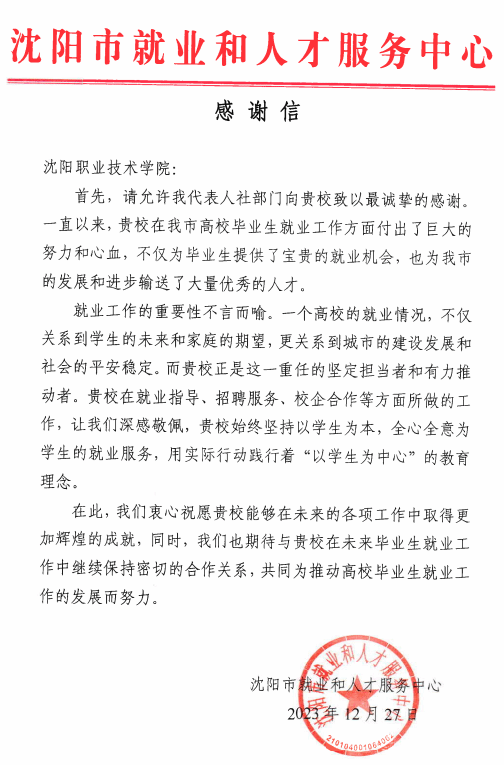 作为沈阳市唯一一所市属职业院校,近年来学校一直以为辽沈地区输送生产一线的高素质、高技能人才为己任,立足服务区域经济社会发展,服务老工业基地转型升级和支柱产业的人才需求,积极拓宽毕业生就业渠道和资源,全力推进毕业生更高质量充分就业。学校2023届毕业生5905人,留沈就业人数2848人,留沈就业比例49.19%,为沈阳市各项事业的发展建设输送了大量优秀人才。学校的就业工作得到沈阳市就业和人才服务中心的认可,并在近日发来感谢信。