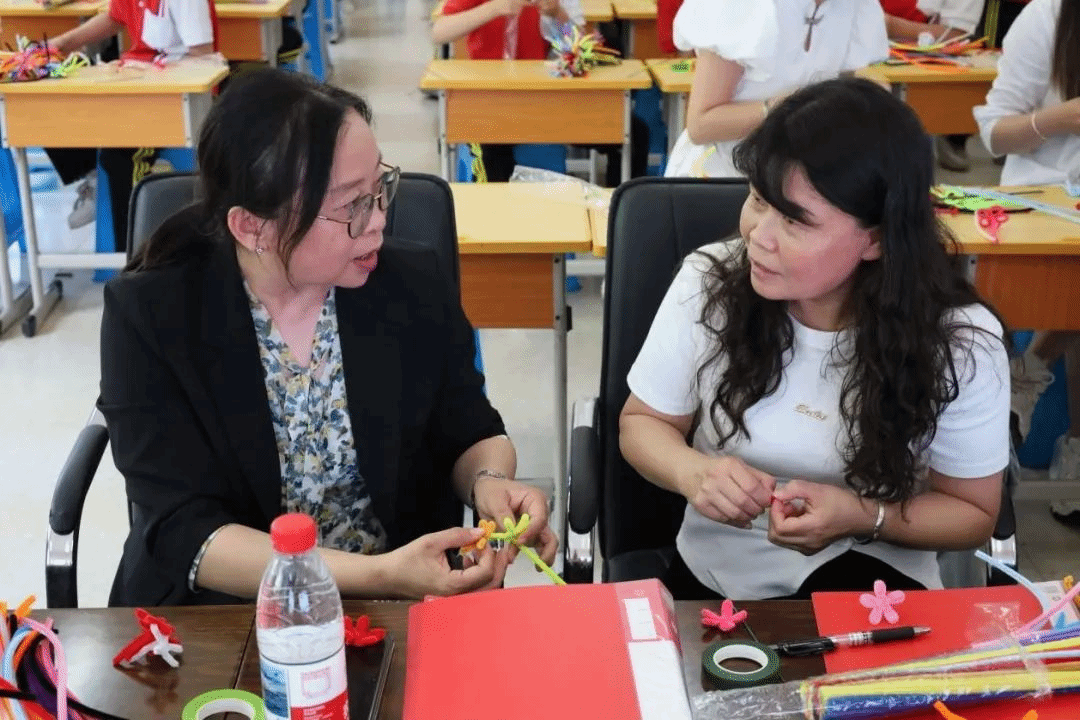基础教学部教师迟晓旭为学生带来一堂生动的美育课程。迟晓旭以“传统与创意共舞”为题,将传统文化与现代创意手工结合在一起,通过诗歌深入讲解“花中四君子”,并结合现场演示、分步讲解和一对一指导,带领学生用彩色扭扭棒制作梅花。孩子们发挥想象力,大胆尝试色彩搭配和结构设计,现场气氛活跃。“原来简单的扭扭棒能做出这么漂亮的花!”一名学生举着完成的作品兴奋地说。此次课程不仅锻炼了学生的动手能力,更通过艺术创作激发了他们对美的感知和创造热情。