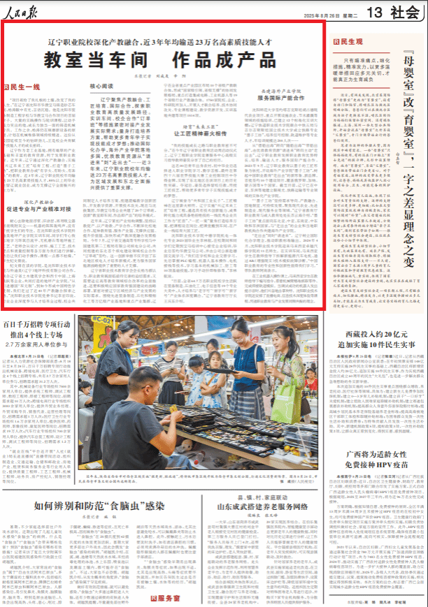 人民日报社会版头条点赞辽宁职业院校深化产教融合:教室当车间 作品成产品