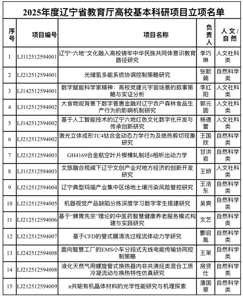 8月29日,辽宁省教育厅发布《关于公布2025年度高校基本科研项目立项结果的通知》,学校15项科研项目被批准立项,其中,自然科学类10项,人文社科类5项,立项数量再创新高。