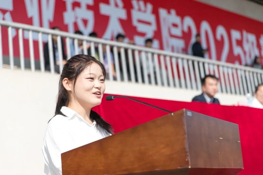 健康管理学院2025级护理专业新生李心如作为新生代表发言。她真诚地分享了自己的求学初心与军训感悟,并郑重承诺未来三年将以军训精神为激励,在专业学习中深耕细作,努力成长为知识扎实、技能精湛、品德高尚的高技能人才,为学校发展与社会进步贡献青春力量。