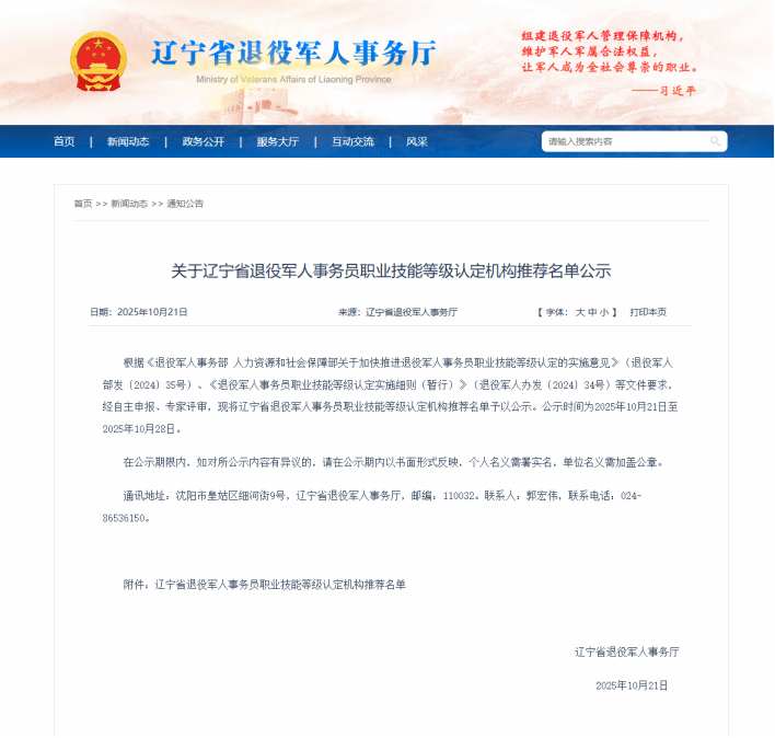 近日,经辽宁省退役军人事务厅、辽宁省人力资源和社会保障厅评审、答辩,我校拟确定为退役军人事务员职业技能等级认定机构,并作为省内仅有的3家机构之一予以公示。