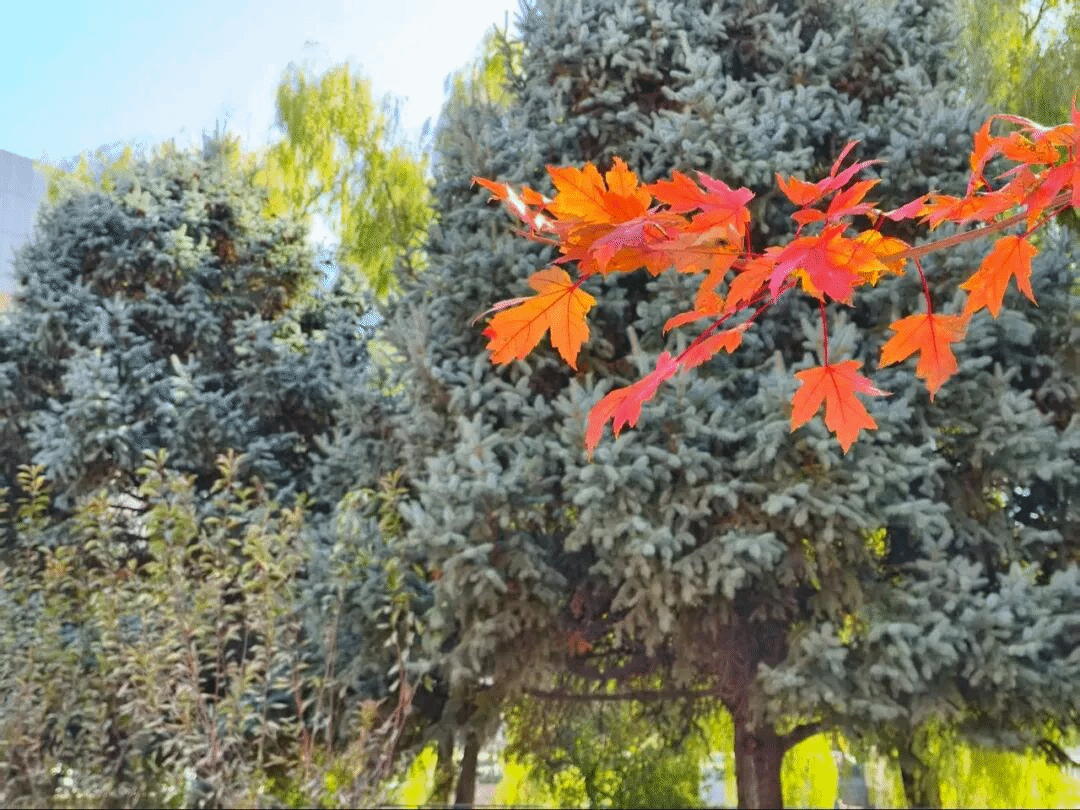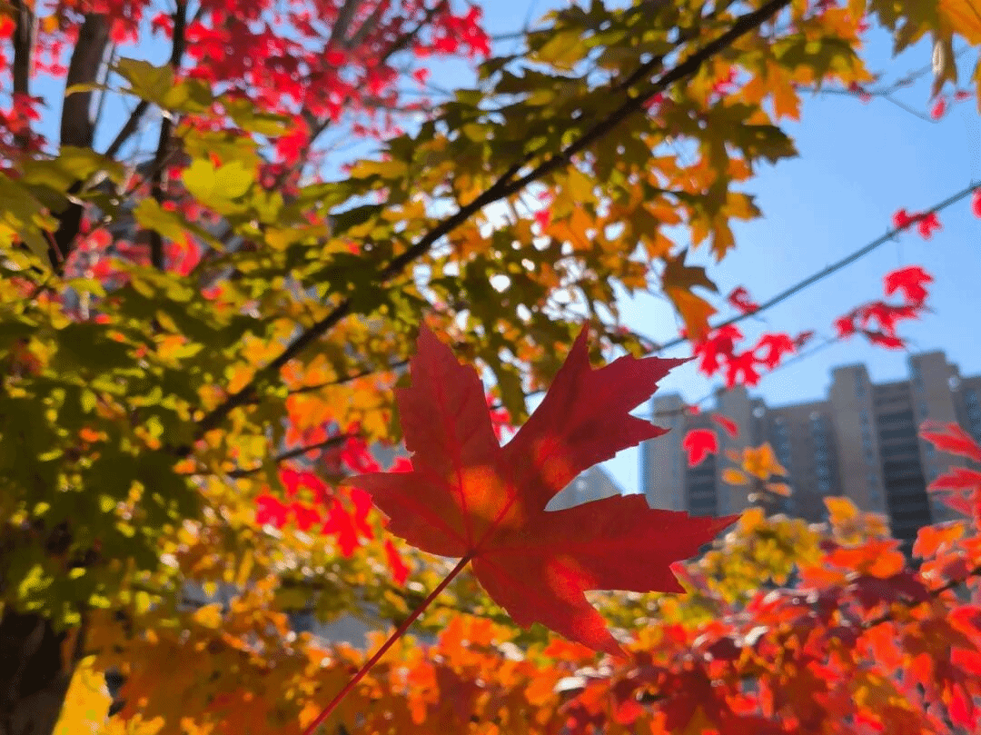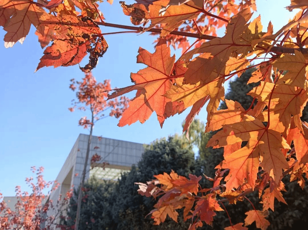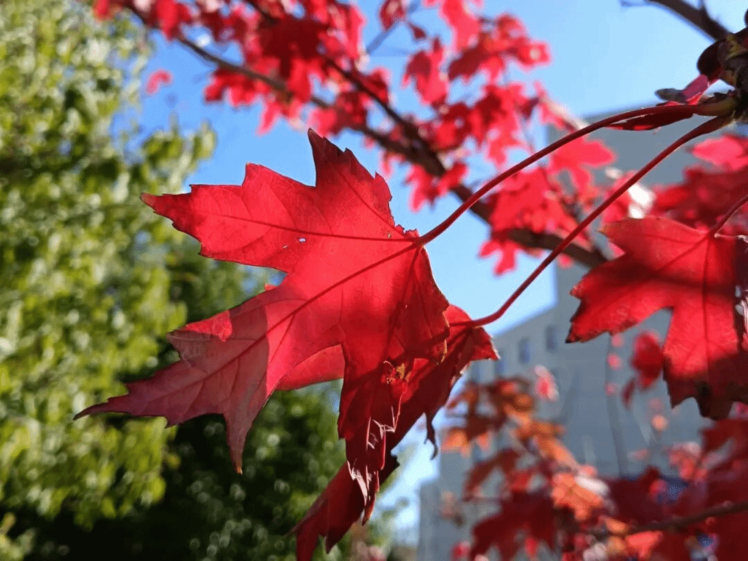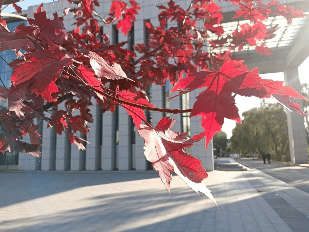 秋日沈职,最动人的是枫叶的热烈。叶片从浅红渐变为深红,教学楼旁的枫树林耀眼夺目,似燃烧的火焰与跳动的精灵。风过叶摇,阳光洒落,灵动的枫叶红得热烈而不张扬。火红枫叶与湛蓝天空相映,落叶轻旋飘落,无时无刻不藏着秋日深情,让人沉醉其间。