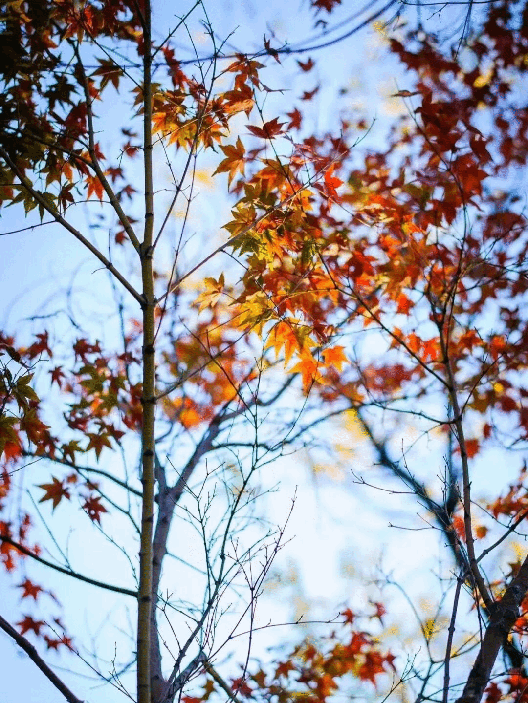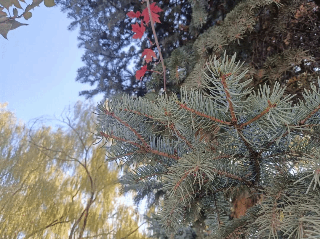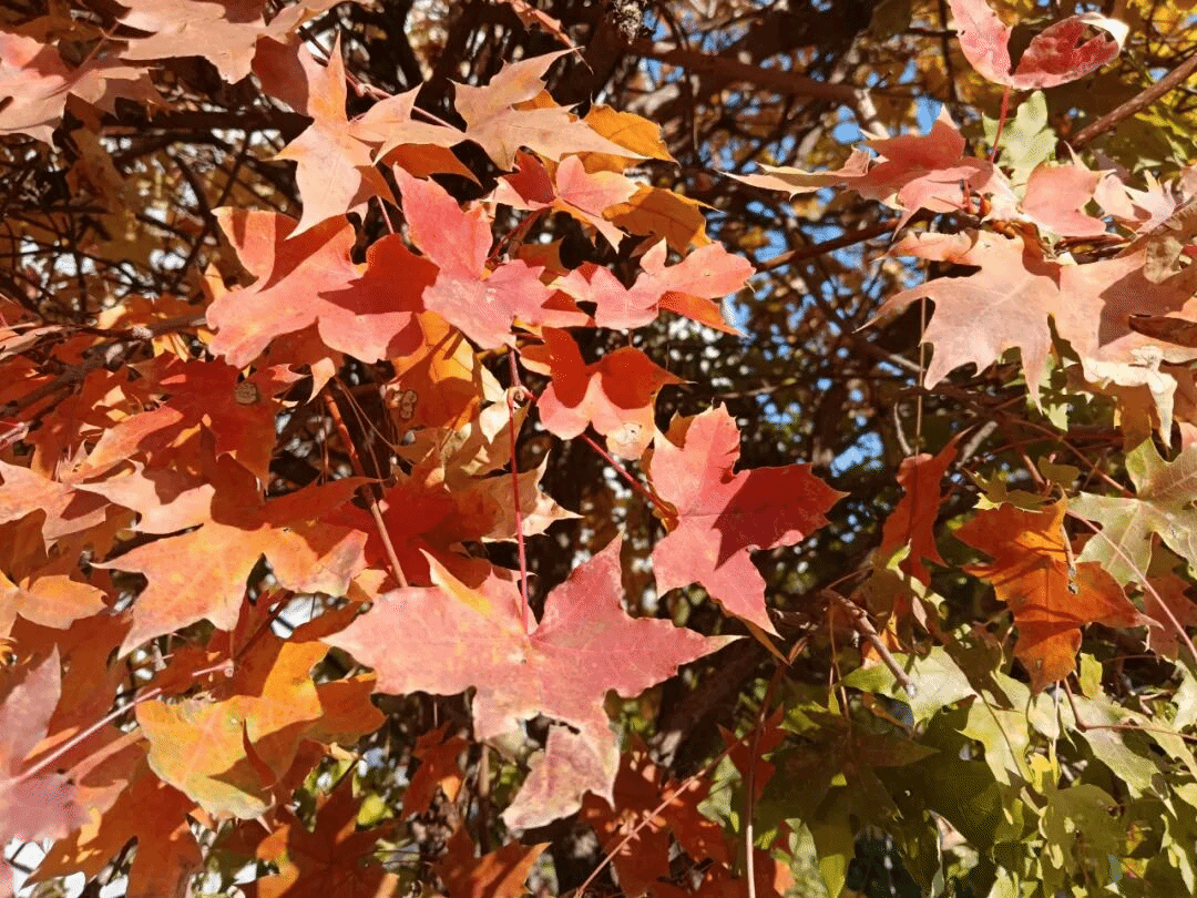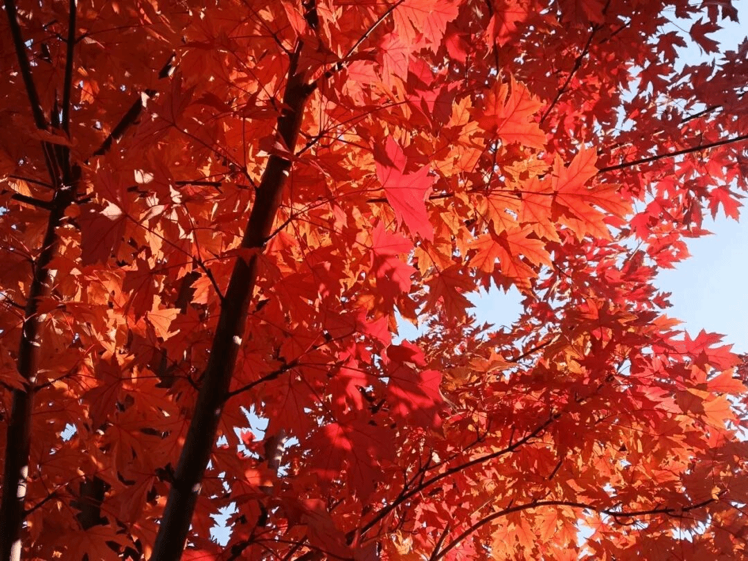 秋日沈职,最动人的是枫叶的热烈。叶片从浅红渐变为深红,教学楼旁的枫树林耀眼夺目,似燃烧的火焰与跳动的精灵。风过叶摇,阳光洒落,灵动的枫叶红得热烈而不张扬。火红枫叶与湛蓝天空相映,落叶轻旋飘落,无时无刻不藏着秋日深情,让人沉醉其间。
