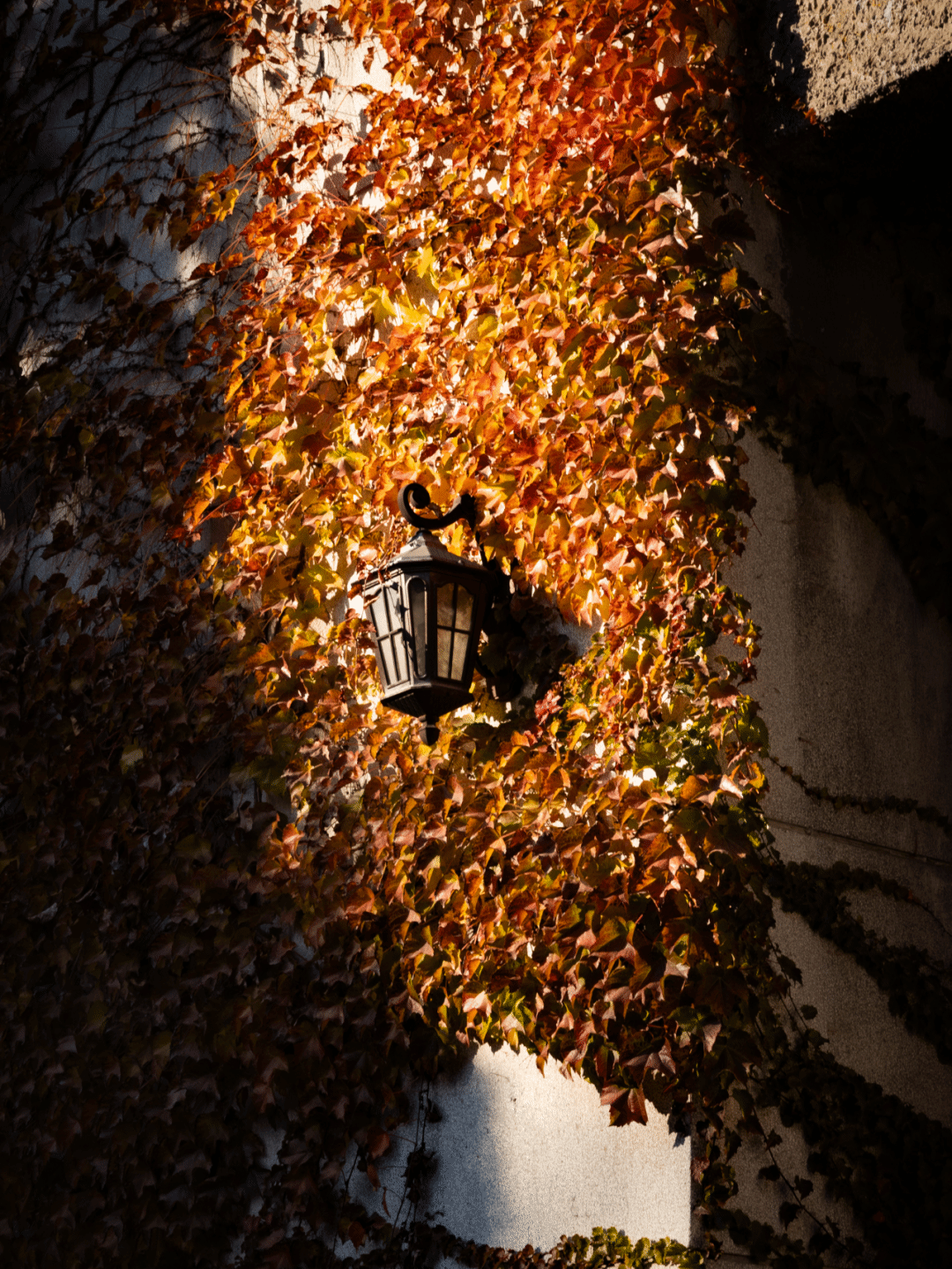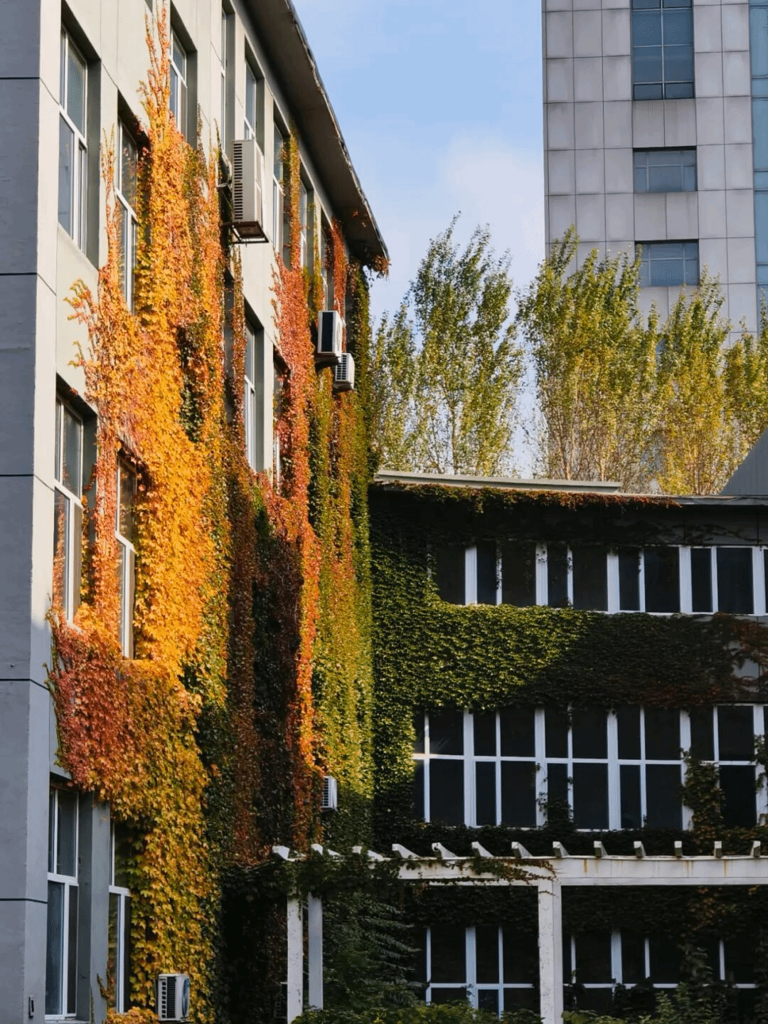实训楼的墙面,早已被爬山虎铺满了深浅不一的绿与红。翠绿的藤蔓缠绕着墙体,间或点缀着几片深红的叶片,像是大自然精心绘制的油画。阳光透过藤蔓的缝隙,在墙面投下斑驳的光影,与实训楼的砖瓦相映,既有工业风的沉稳,又有秋日的灵动。这份自然与建筑的交融,成了沈职秋日里最独特的风景。