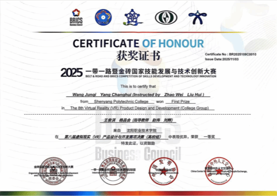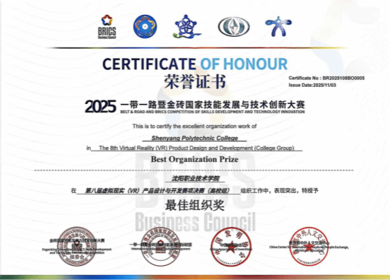 近日,2025一带一路暨金砖国家技能发展与技术创新大赛第八届虚拟现实(VR)产品设计与开发赛项决赛(高校组)在昆明冶金高等专科学校举办,共有来自全国的61支优秀队伍参与决赛。经过激烈角逐,我校信息工程学院同学王俊淇与杨昌会凭借出色的专业能力与创新设计,以总决赛第五名的优异成绩荣获一等奖,我校荣获最佳组织奖。这一成绩充分展现了我校在虚拟现实技术领域的教学实力与育人成果。