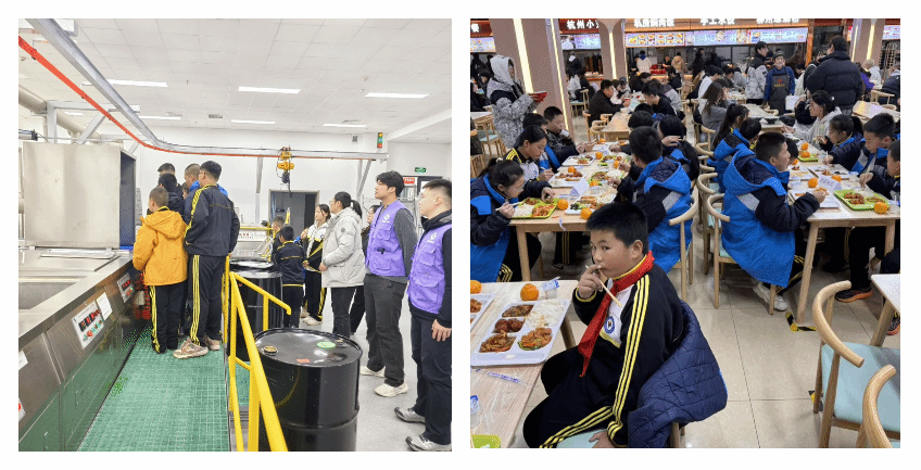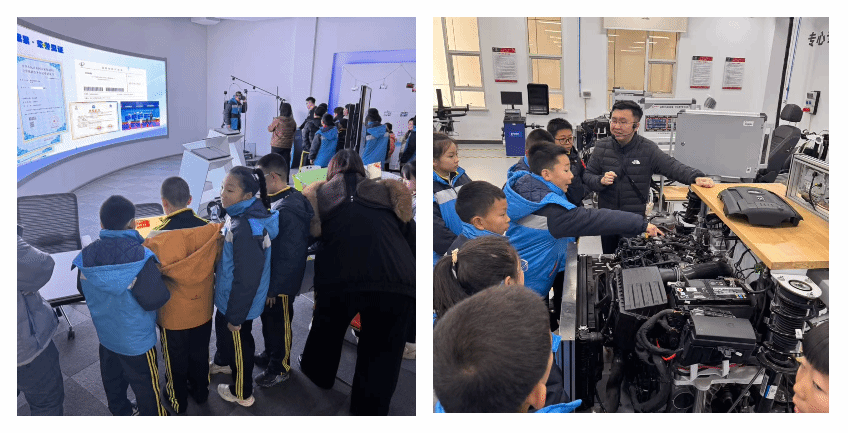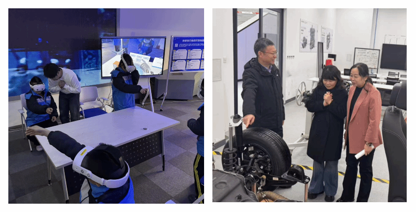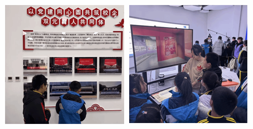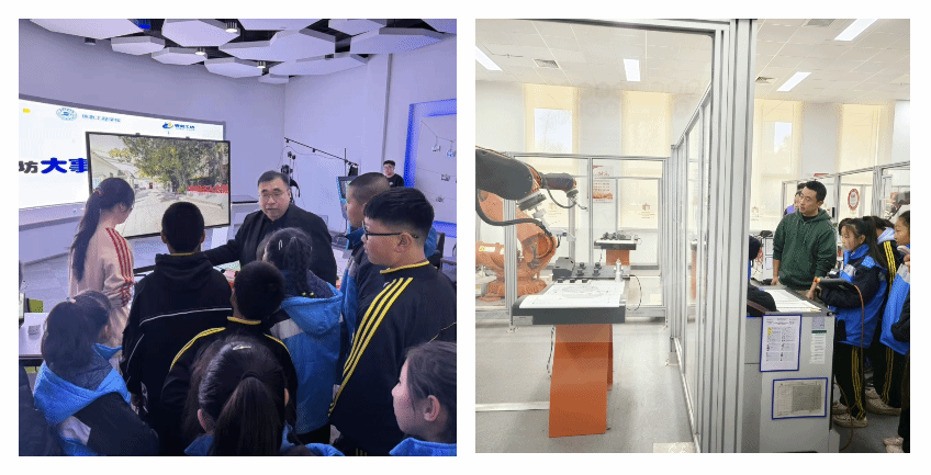 在中德学院工业工坊,学生们观摩汽车底盘拆装、工业机器人精准作业,触摸安全部件、了解劳动工具使用,感受工业生产的精密之美与技能劳动的严谨价值;在信息工程学院,通过VR党建展馆、青花瓷VR体验和MR学习系统,沉浸式感受科技创意之美,理解脑力劳动与创新实践的重要意义。参观途中,志愿者沿途介绍校园环境维护中的平凡劳动,引导学生珍惜园丁、保洁员等劳动者的付出,树立正确的劳动价值观;用餐期间,通过礼仪引导与交流分享,深化学生对不同职业劳动价值的认知。