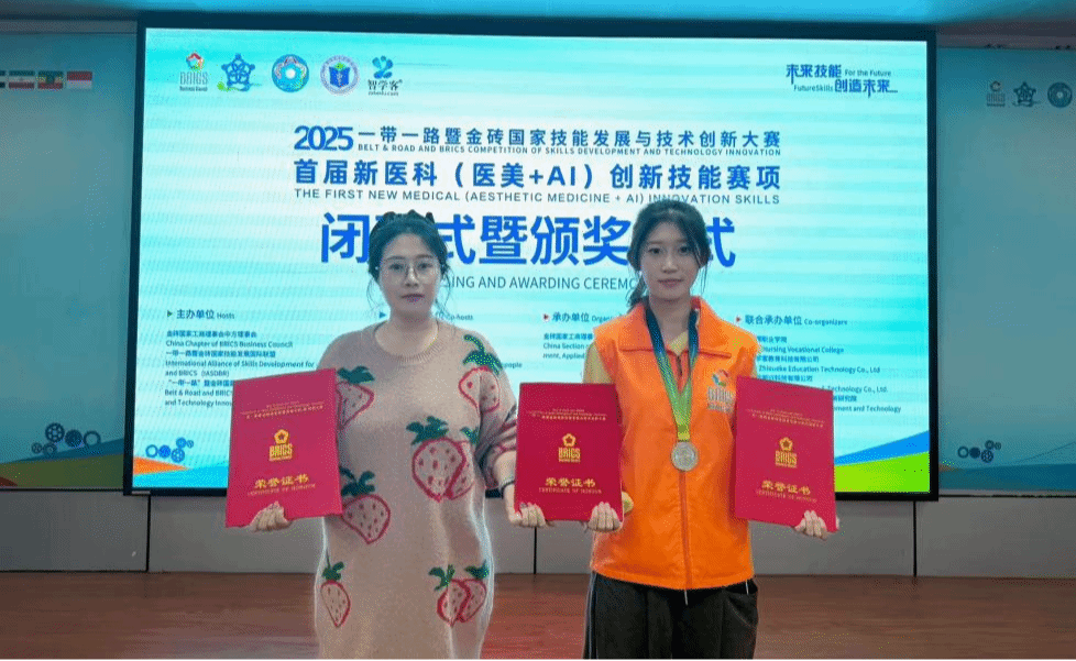 本次大赛由金砖国家工商理事会中方理事会等权威单位主办,聚焦“医美+AI”技术融合趋势,是检验新医科领域技能人才培养质量的重要平台。此次获奖既是健康管理学院医学美容技术专业“岗课赛证”综合育人模式的成效体现,也彰显学院在医美与新兴技术融合教学中的探索成果。