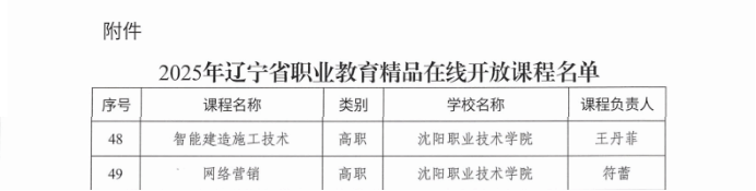 近日,辽宁省教育厅下发《关于公布2025年度辽宁省职业教育精品在线开放课程名单的通知》,我校《智能建造施工技术》与《网络营销》2门课程入选。