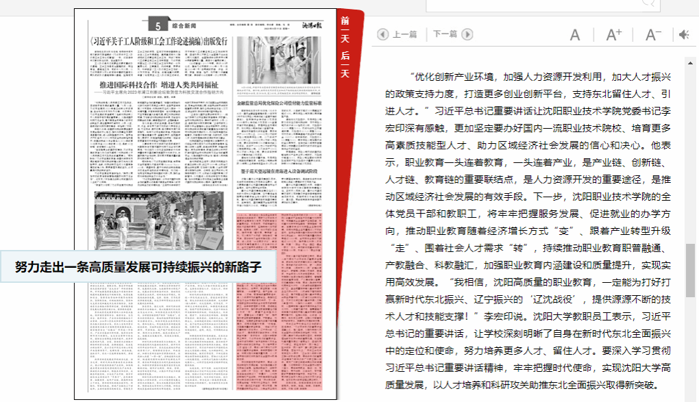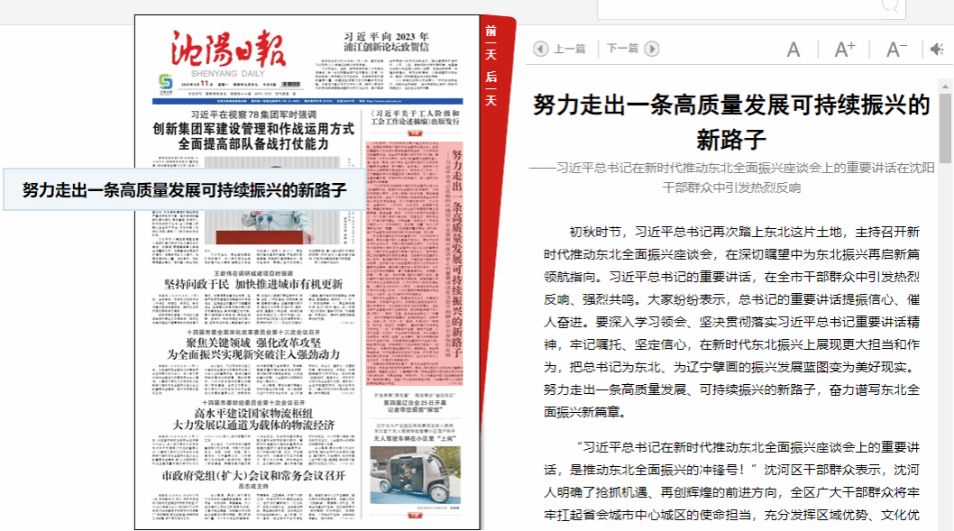 初秋时节,习近平总书记再次踏上东北这片土地,主持召开新时代推动东北全面振兴座谈会,在深切瞩望中为东北振兴再启新篇领航指向。习近平总书记的重要讲话,在全市干部群众中引发热烈反响、强烈共鸣。大家纷纷表示,总书记的重要讲话提振信心、催人奋进。要深入学习领会、坚决贯彻落实习近平总书记重要讲话精神,牢记嘱托、坚定信心,在新时代东北振兴上展现更大担当和作为,把总书记为东北、为辽宁擘画的振兴发展蓝图变为美好现实。努力走出一条高质量发展、可持续振兴的新路子,奋力谱写东北全面振兴新篇章。“习近平总书记在新时代推动东北全面振兴座谈会上的重要讲话,是推动东北全面振兴的冲锋号!”沈河区干部群众表示,沈河人明确了抢抓机遇、再创辉煌的前进方向,全区广大干部群众将牢牢扛起省会城市中心城区的使命担当,充分发挥区域优势、文化优势、金融优势、人才优势、科创优势,在建强产业链、提高区域竞争力、优化政治生态和营商环境上深耕厚植,推进金融、商贸、文旅三大主导产业转型升级,大力发展以楼宇为载体的“五型经济”和数字经济,打造文商旅融合、科技金融、总部经济、数字经济等核心IP,切实将商流、客流等“流量”转化为发展新经济的“增量”,为区域高质量发展注入新动能,在辽宁全面振兴新突破三年行动中冲在前、扛大旗。东北是我国向北开放的重要门户。习近平总书记强调,要加快建设现代化基础设施体系,提升对内对外开放合作水平。市商务局干部职工表示,习近平总书记在新时代推动东北全面振兴座谈会上的重要讲话,为推动东北全面振兴明确了目标任务,是开展各项工作的重要指引和根本遵循。沈阳是东北亚国际化中心城市,是中国对接东北亚、沟通欧亚大陆桥的前沿地带。全市商务战线将全面贯彻落实习近平总书记重要讲话精神,锚定建设国家中心城市的目标,依托区位优势和资源禀赋,着力完善通道平台,深度融入共建“一带一路”,加快构建以国内大循环为主体、国内国际双循环相互促进的新发展格局,在推进高水平对外开放上实现新突破。以对外开放为城市发展战略,以提升经济总体实力为根本,以推进贸易平台和交易方式转型为抓手,以优化营商环境和增强贸易主体活力为目标,全力打造对外开放新前沿。推动东北全面振兴,根基在实体经济,关键在科技创新,方向是产业升级。法库县工信局党组书记、局长宋德伟说,我们将牢记总书记的殷殷嘱托,结合法库产业基础实际及空间布局,把创新型县建设作为县乡两级“一把手”工程,扭住自主创新这个“牛鼻子”,主动对接国家战略需求,坚持创新生态、创新平台、创新人才“三位一体”推进,引育壮大“新技术、新产业、新业态、新模式”,重点构建辽宁法库经济开发区“一区”引领陶瓷产业园、通航产业园、辽河产业园“三片区”产业创新发展空间,深化与高校科研院所“前院+后园”合作模式,建设法库陶瓷新材料产业研究院、沈阳通用航空高技术产业研究院、新能源实验室、法库县现代农业创新研究院四个“创新平台”,做强无机非金属新材料、通用航空、新能源装备制造、农产品精深加工四条产业链,吸引更多创新资源汇聚法库,切实把资源优势、生态优势转化为经济优势、发展优势和竞争优势。加强党的领导和党的建设,是东北全面振兴的根本保证。市委组织部党员干部表示,要深入贯彻落实习近平总书记重要讲话精神,提高政治站位,认真履职尽责,聚焦全面振兴新突破三年行动和“振兴新突破、我要当先锋”专项行动,充分发挥组织部门在加强党的领导、推进党的事业、全面从严治党中的职能作用,为中国式现代化沈阳实践提供坚强组织保证。(下转5版) (上接1版,努力走出一条高质量发展可持续振兴的新路子)要把习近平总书记重要讲话精神作为党员、干部教育培训的重要内容,引导党员、干部牢固树立和践行正确政绩观。坚持新时代好干部标准,拓宽选人视野,优化干部队伍结构,持续开展“晒成绩、赛贡献”活动,充分激发广大干部“拼抢争实”精气神。用好中央及省委支持沈阳人才政策,深入实施“兴沈英才计划”,制定实施吸引集聚高层次人才三年行动计划,全方位培养引进用好人才。开展携手打造更加幸福美好家园专项行动,深入推进党建引领“两邻”基层治理,推动基层党组织全面进步全面过硬。抓好第一批、第二批主题教育衔接联动,推动主题教育走深走实。“优化创新产业环境,加强人力资源开发利用,加大人才振兴的政策支持力度,打造更多创业创新平台,支持东北留住人才、引进人才。”习近平总书记重要讲话让沈阳职业技术学院党委书记李宏印深有感触,更加坚定要办好国内一流职业技术院校、培育更多高素质技能型人才、助力区域经济社会发展的信心和决心。他表示,职业教育一头连着教育,一头连着产业,是产业链、创新链、人才链、教育链的重要联结点,是人力资源开发的重要途径,是推动区域经济社会发展的有效手段。下一步,沈阳职业技术学院的全体党员干部和教职工,将牢牢把握服务发展、促进就业的办学方向,推动职业教育随着经济增长方式“变”、跟着产业转型升级“走”、围着社会人才需求“转”,持续推动职业教育职普融通、产教融合、科教融汇,加强职业教育内涵建设和质量