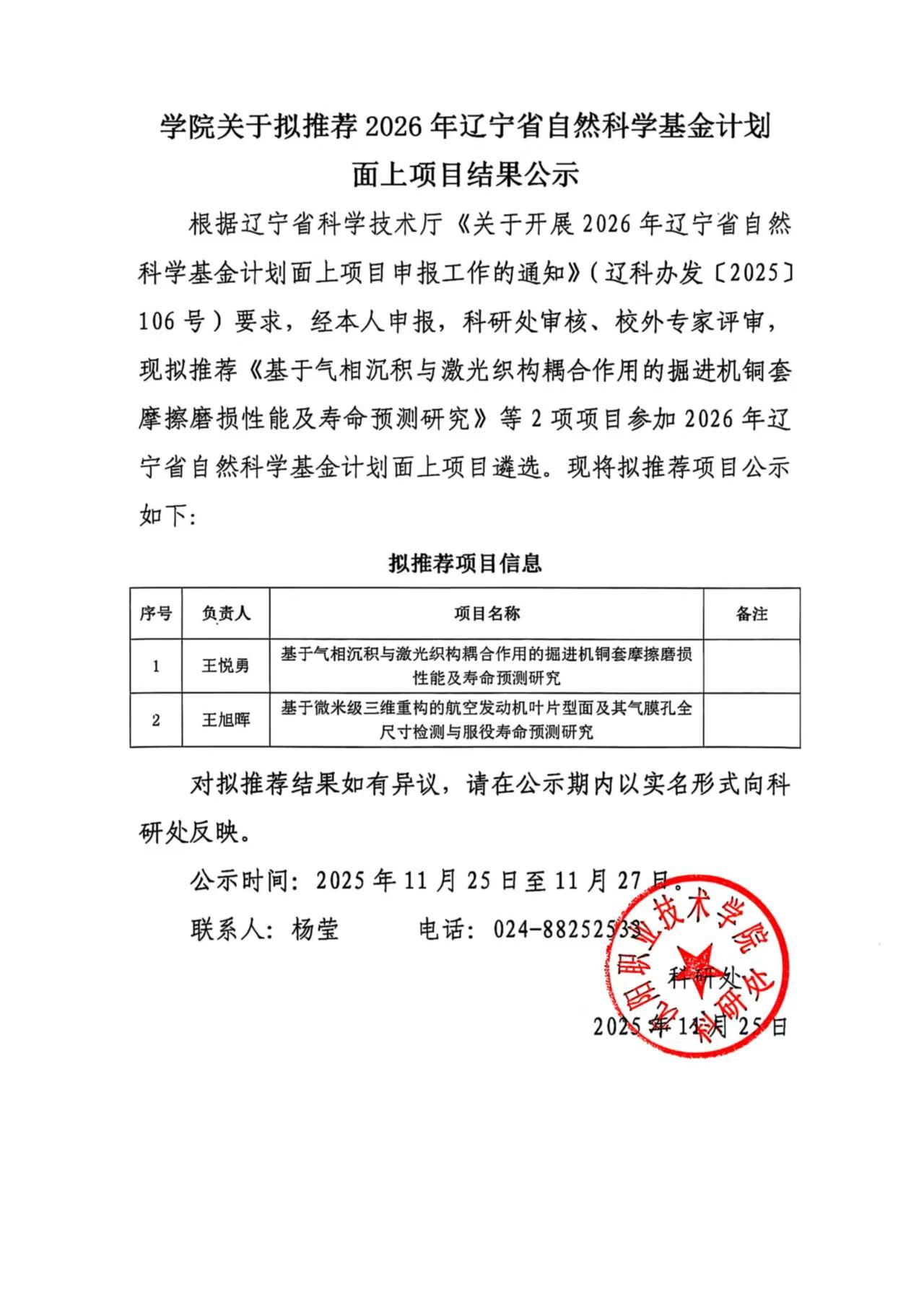 关于推荐2026年辽宁省自然科学基金计划面上项目结果公示
