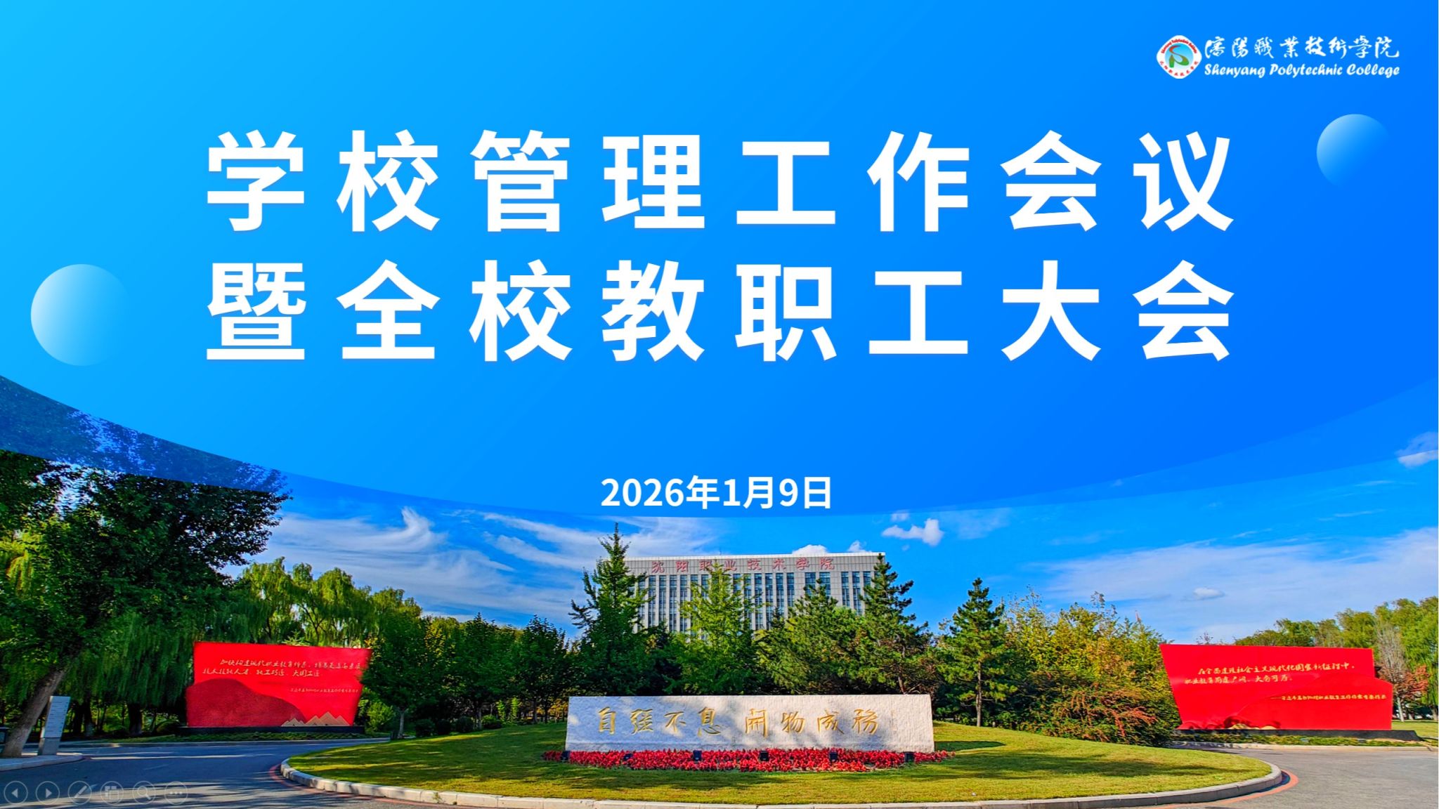 1月9日,沈阳职业技术学院在数字大厦一楼报告厅召开管理工作会议暨全校教职工大会。会议旨在进一步贯彻落实省委教科工委《关于进一步加强职业学校管理工作的若干举措》精神,全面总结2025年学校工作,重点部署2026年寒假及新学期重点工作。学校领导班子、中层干部及全体教职工共500人参加会议。 会议在数字大厦一楼报告厅召开党委书记李宏印出席会议并讲话。李宏印强调,学校发展正处于前所未有的战略机遇期,必须要把牢牢握好办学层次跃升的内生机遇、...