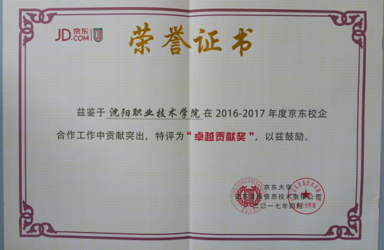 工商管理学院以共建京东校园实训中心为良好开端,积极推进与行业领军企业的合作。近二年来,与京东集团开展全方位、多层次、多项目合作,分别与京东全国客服中心、京东东北公司、京东大学进行合作开发校内外实训基地、创新人才培养模式、共建新型专业,为京东集团输送近百名优秀专业人才,为学院赢得良好社会声誉。日前,京东集团授予沈阳职业技术学院2016-2017年度京东校企合作“卓越贡献奖”。