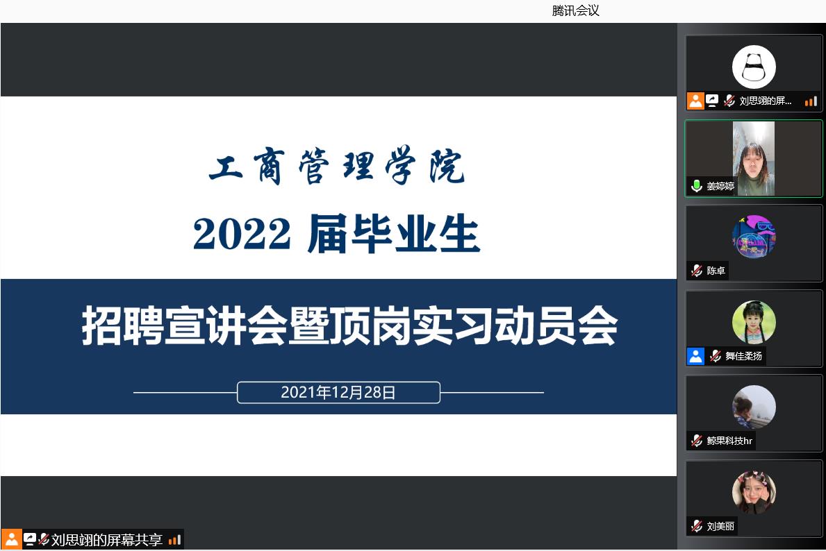 为加强学生对顶岗实习的认识和了解,拓宽毕业生就业渠道,2021年12月28日,工商管理学院在线上召开了 2022 届毕业生招聘宣讲会暨顶岗实习动员会。工商管理学院院长侯宏波、党总支书记姜婷婷出席会议。招聘企业代表、教师代表、学生代表及2022届全体毕业生一同参会。会议由工商管理学院党总支书记姜婷婷主持。