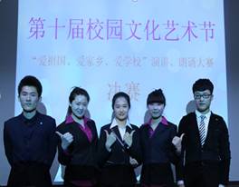 在本次比赛中我院采用了“以老带新”的方式备战决赛,这样参赛者可以互相交流,传授经验。其次就是参赛者的自身发挥,朗诵演讲实际上是由语言,感情和形体三部分组成的,赛场上我们的参赛者可以说将这三部分展现的淋漓尽致,肢体动作和语言抒发连贯流畅,充分表达了同学们热爱祖国、热爱家乡、热爱学校的真挚情感。