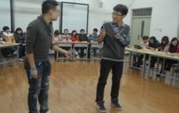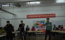 为了促进工商管理学院外省学生之间的交流,营造和谐融洽的集体氛围,丰富同学们的校园生活,2013年12月24日,工商管理学院组织了外省学生联谊系列活动。联谊会在温馨快乐的气氛中拉开了帷幕。本次活动分为自我介绍、互动游戏、抽“奖”三个环节。在自我介绍环节中,同学们加深了彼此的认识和了解,为今后的学习生活搭建了平台。在游戏互动环节,同学被分为四组,在“一只青蛙”、“我错了”“歌词接龙”、“吃苹果”、“吃柚子”等游戏中,同学们配合默契,共同克服一个有一个难关,将现场气氛推向了高潮。