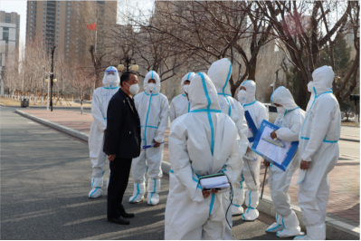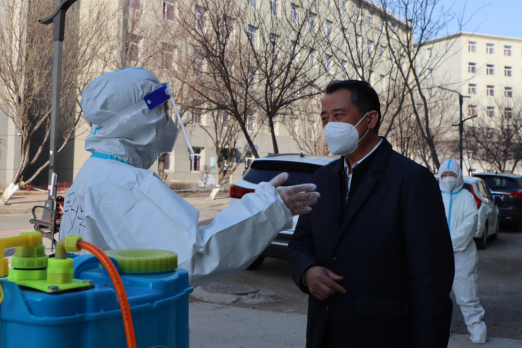 随后,王书记来到1号学生宿舍楼。在寝室楼前,王书记问候了正在消杀的工作人员,对他们连续20天的辛苦付出表示真诚的感谢。王书记询问了同学们在寝室的日常生活状况,并深入了解楼内志愿者数量、餐食供应、超市线上订购等情况,同时表示学院一定会全力以赴保障学生的日常生活所需,在此基础上逐步满足同学们的个性化需求。