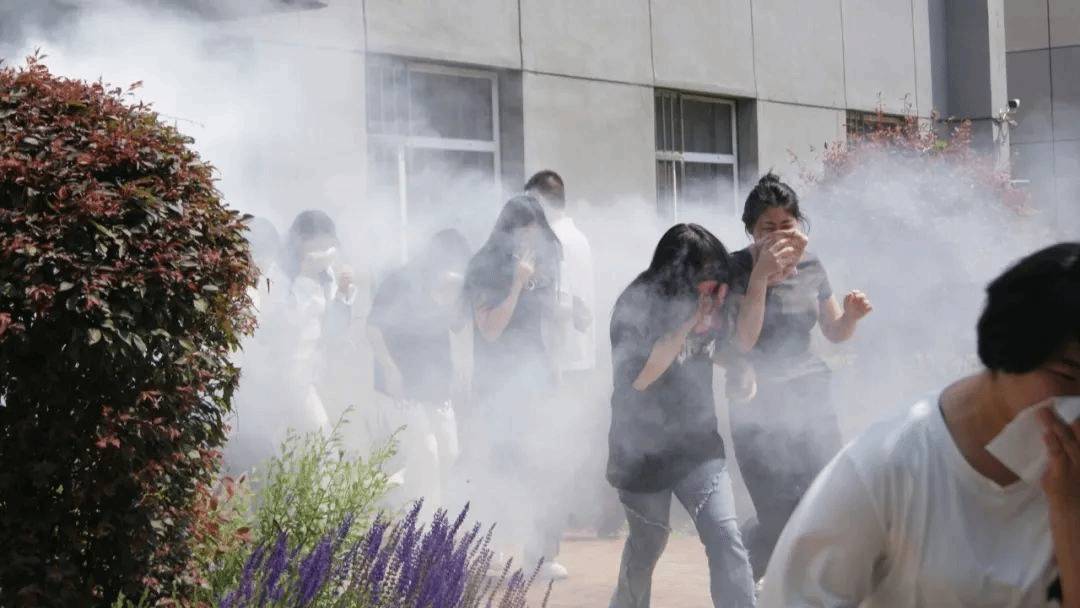 随着急促的消防警报声在宿舍楼内骤然响起,活动第二环节——宿舍消防演练正式拉开帷幕。警报就是命令。宿舍楼内的同学们迅速反应,按照培训所学,熟练地用湿毛巾捂住口鼻、弯腰低姿,沿着预定逃生路线,以最快速度、最有序的方式撤离宿舍。在各寝室长、楼层长和负责老师的沉着指挥下,4、5号宿舍楼全体学生仅用2分04秒,按楼层依次疏散至食堂门口安全区域。疏散全程,师生配合默契十足,疏散流程规范高效,充分展现了大家良好的应急素养,切实达到了“以练促防”的预期目标。