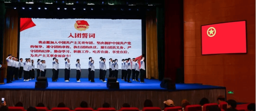 13时30分,仪式在雄壮的国歌声中正式拉开帷幕。马野宣读《关于批准王靖舒等同学加入中国共产主义青年团的决定》,宣布本学期经严格考核、培养的207名新团员名单。各二级学院团委书记为新团员代表佩戴象征光荣与责任的团徽,并颁发团员证。